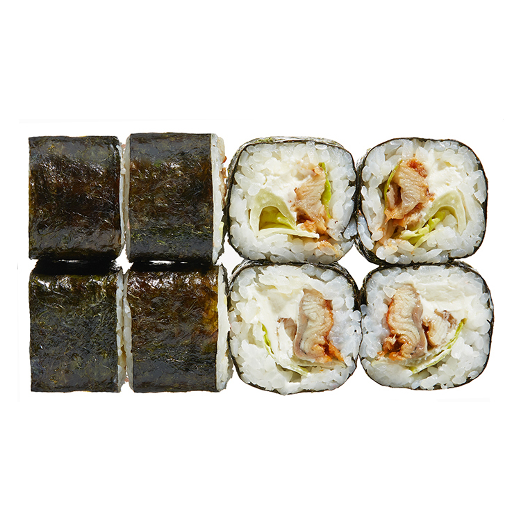 Угорь копчёный, сливочный сыр, салат, рис, нори. Возможно попадание мелких косточек в угре!
