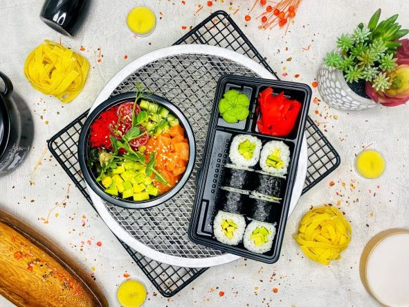 Салат с баклажанами и помидорам, ролл с авокадо.