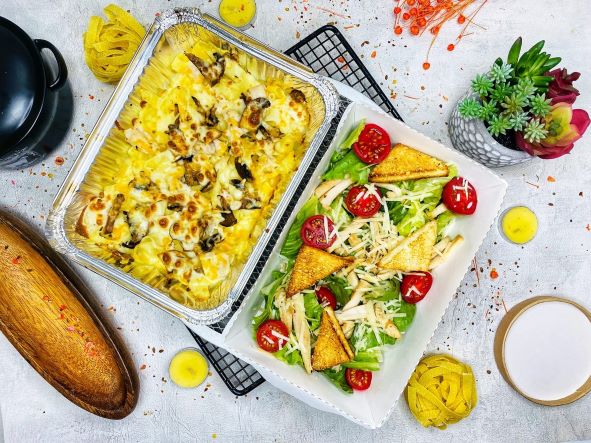Паста с курицей и грибами, салат "Цезарь с курицей".