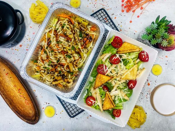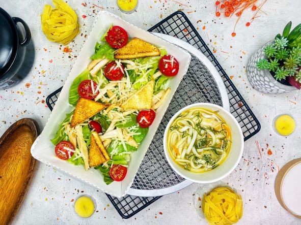 Суп-лапша с курицей, салат "Цезарь с курицей".