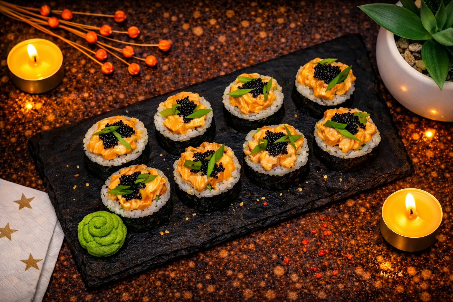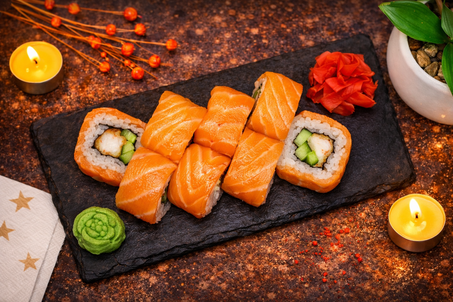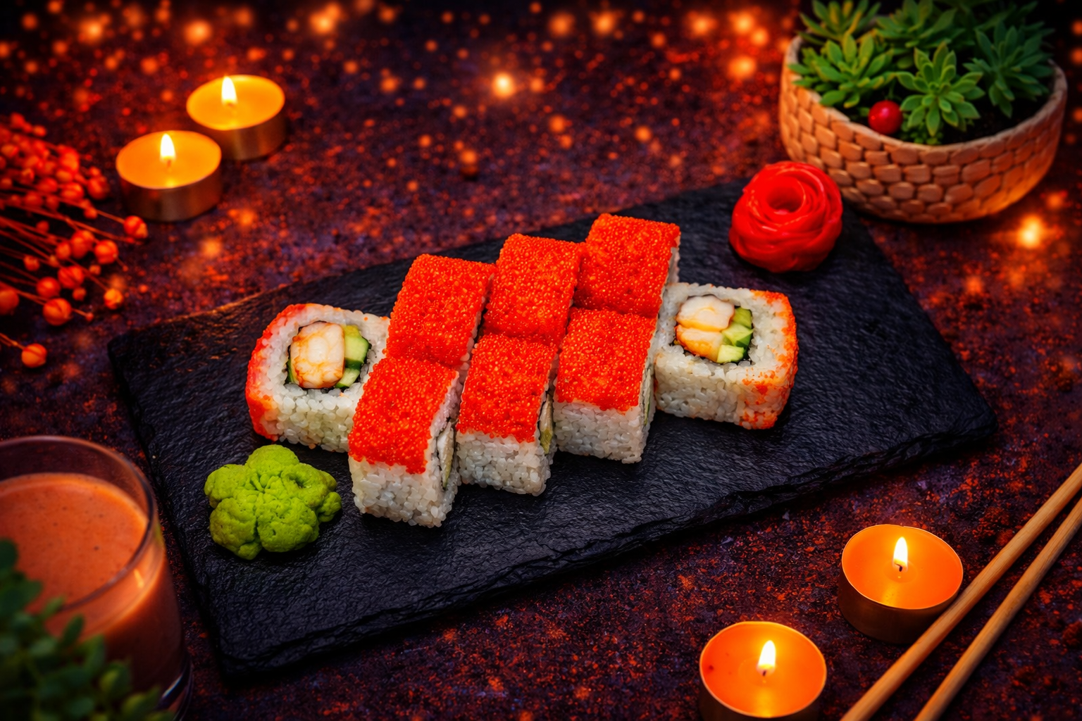 Креветка темпура, лосось, огурец, икра тобико, зелёный лук, нити перца, рис, нори