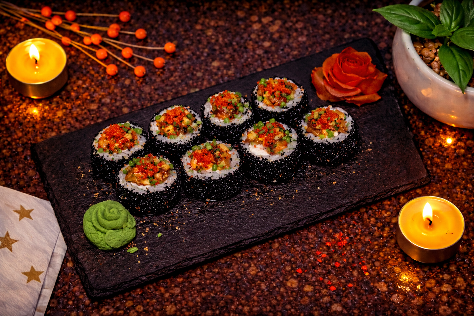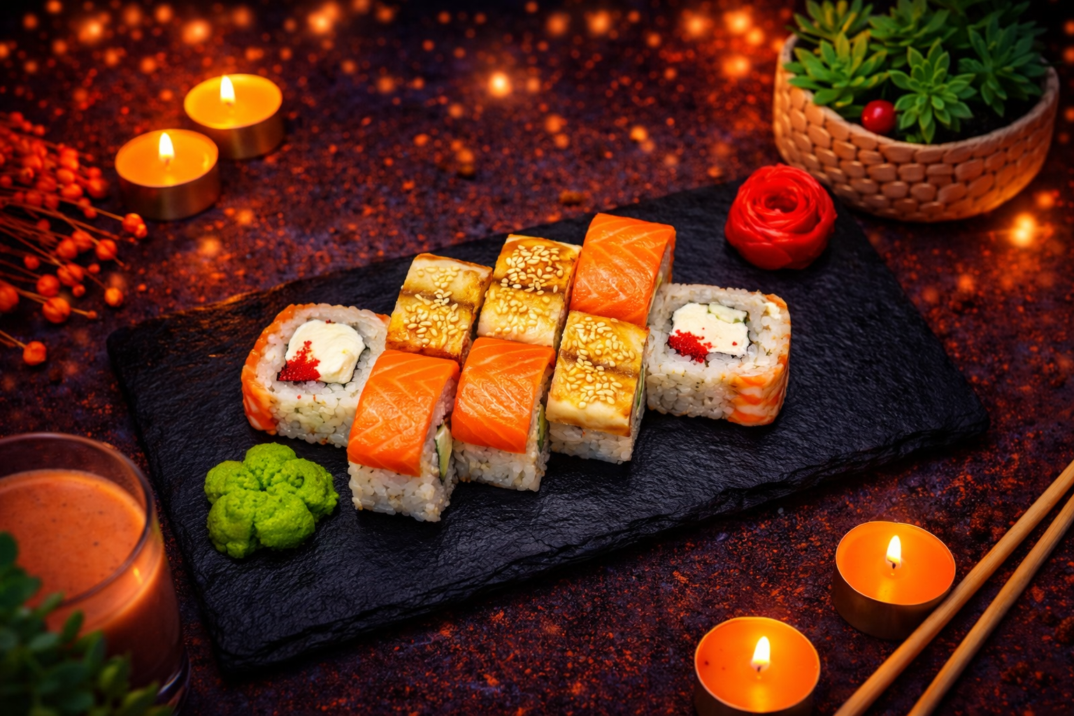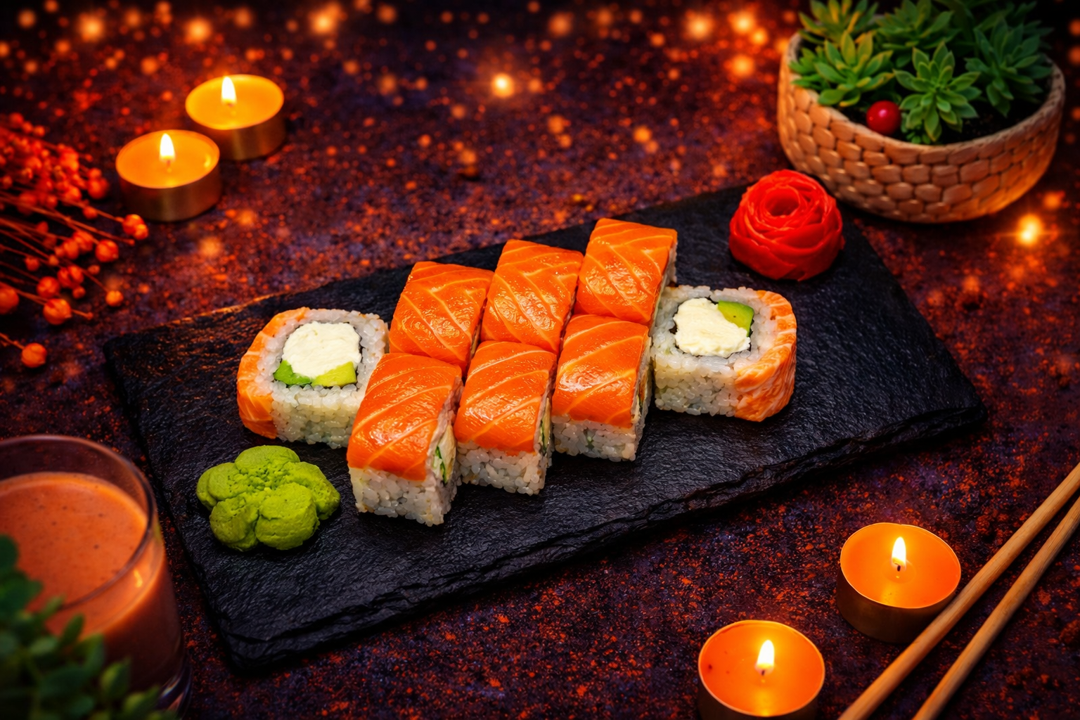 Креветка темпура, лосось, огурец, икра тобико, зелёный лук, нити перца, рис, нори