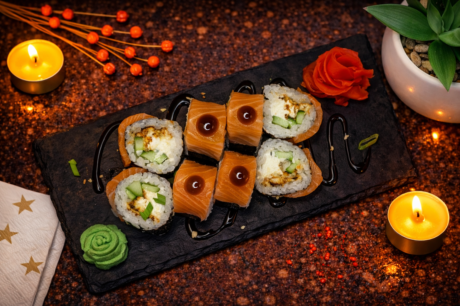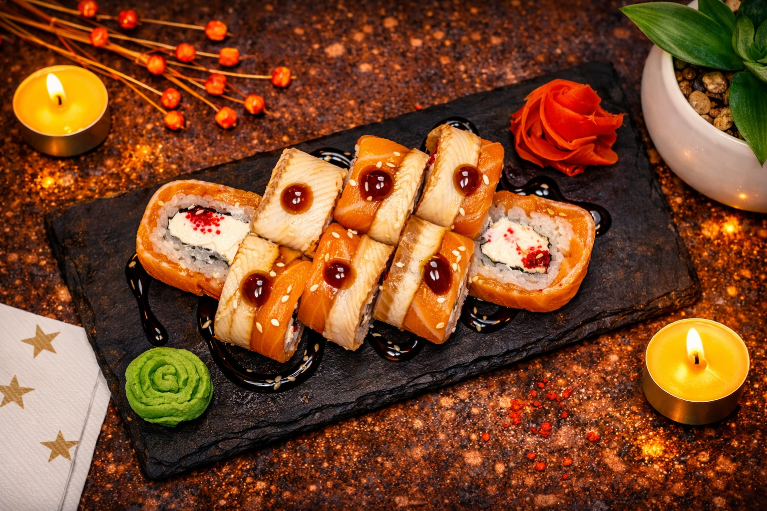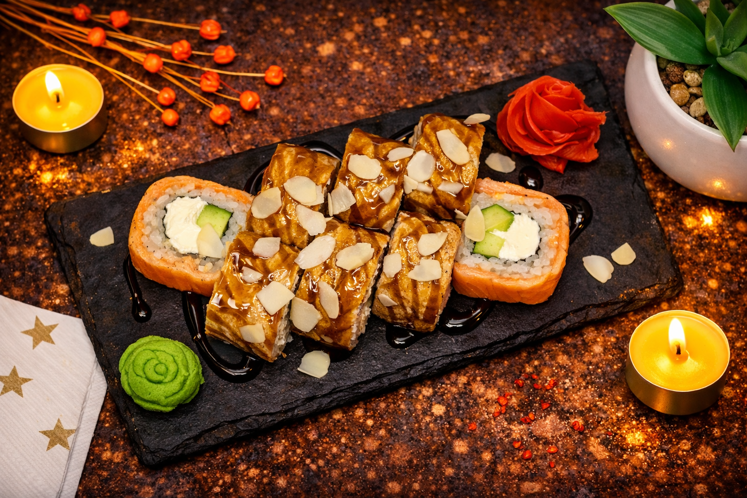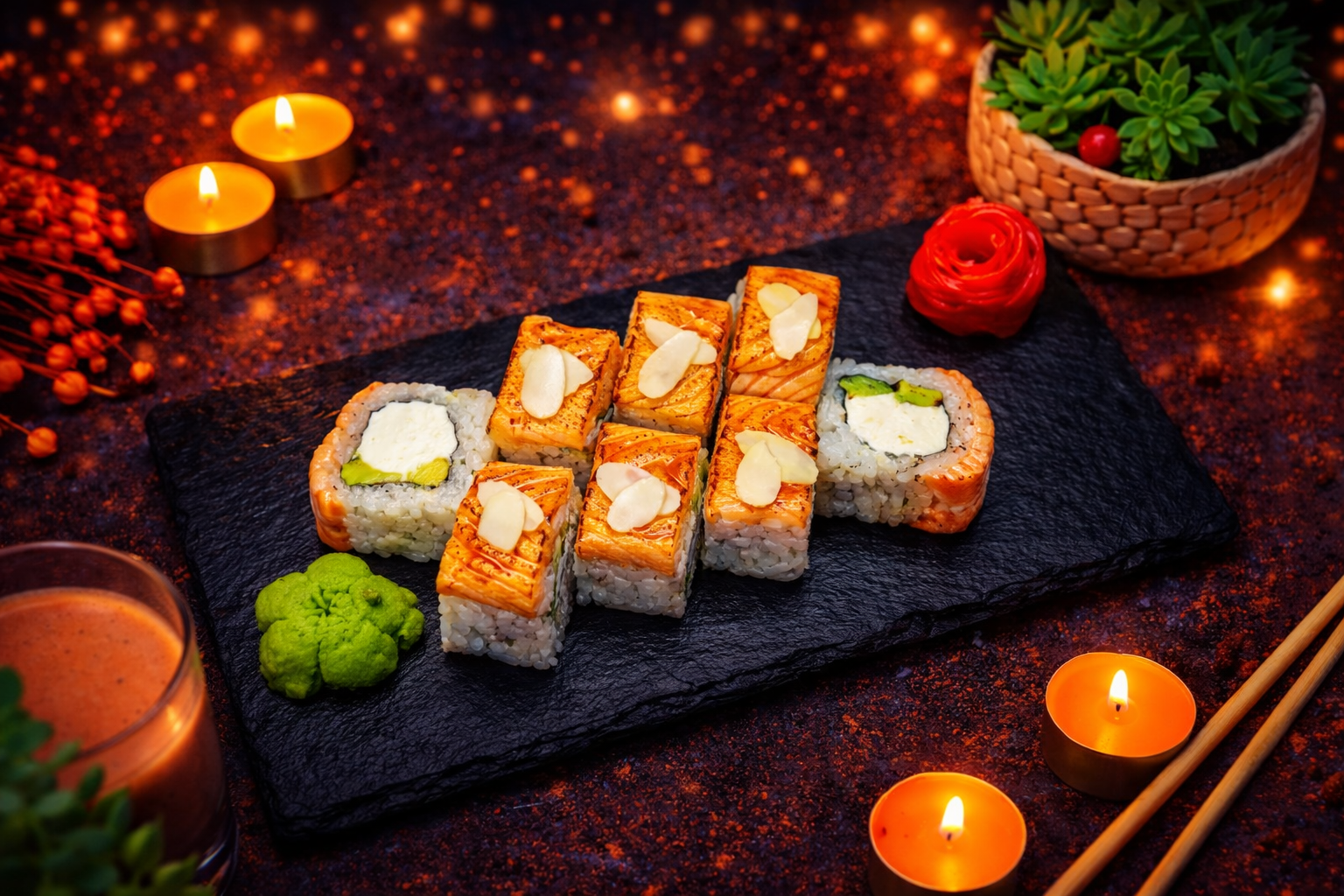 Опалённый лосось, сливочный сыр, авокадо, лепестки миндаля, соус Унаги.