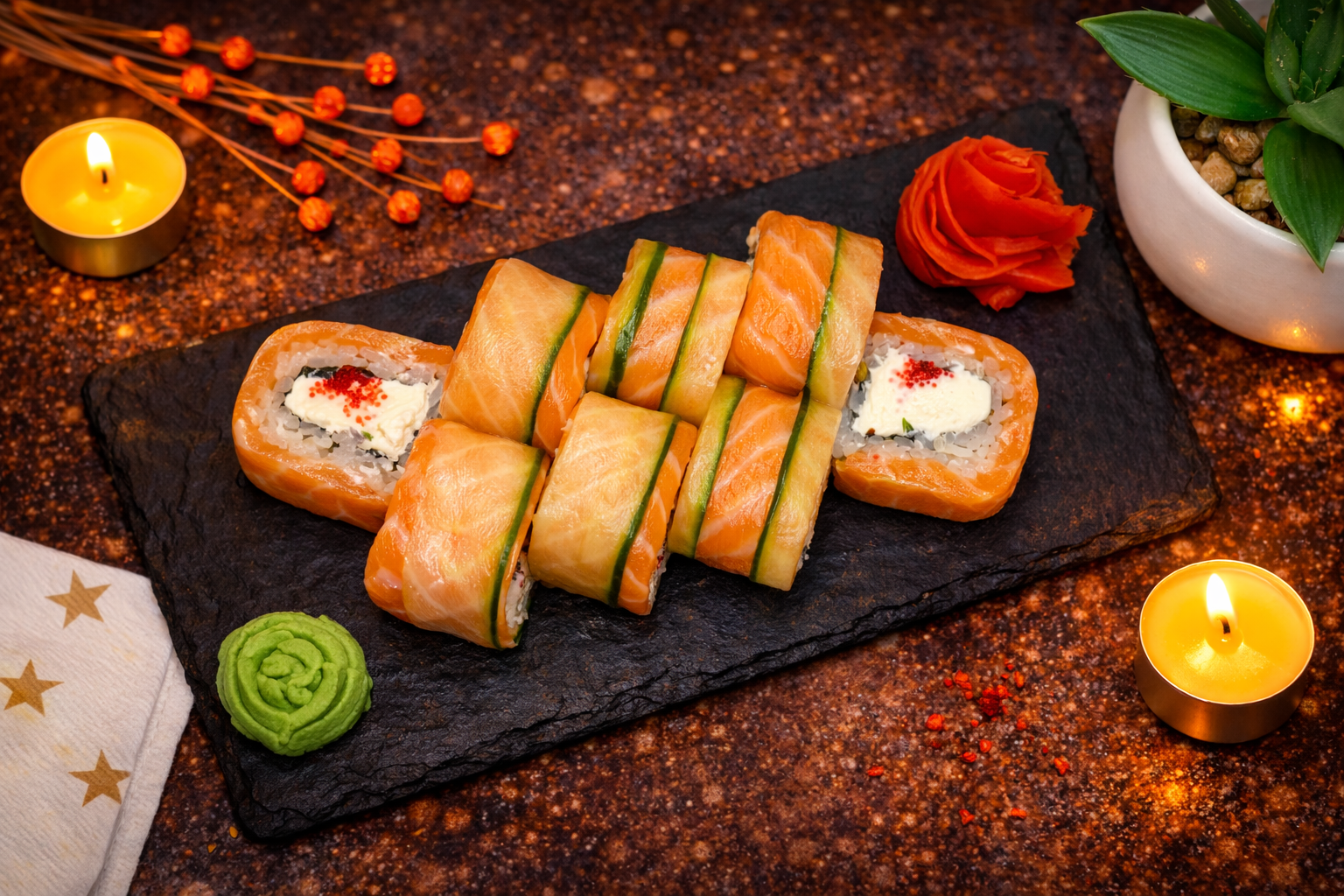 Лосось, огурец, сливочный сыр, икра тобико, рис, нори