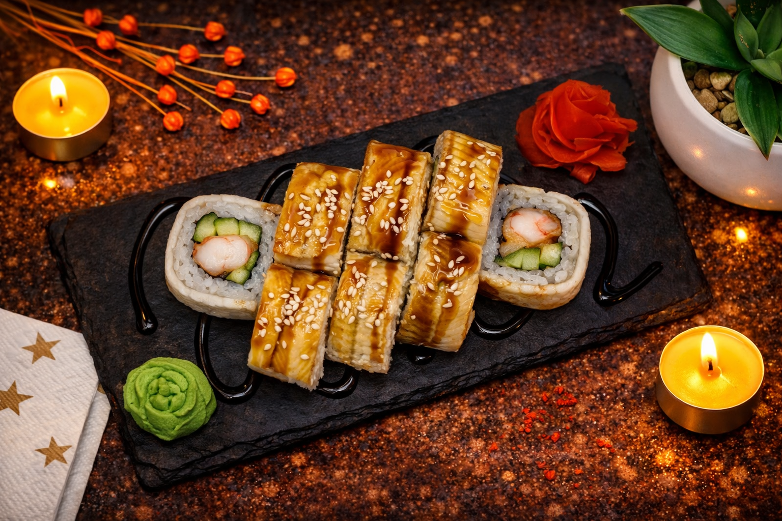 Угорь, креветка темпура, огурец, соус Унаги, кунжут. Возможно попадание мелких косточек в угре!