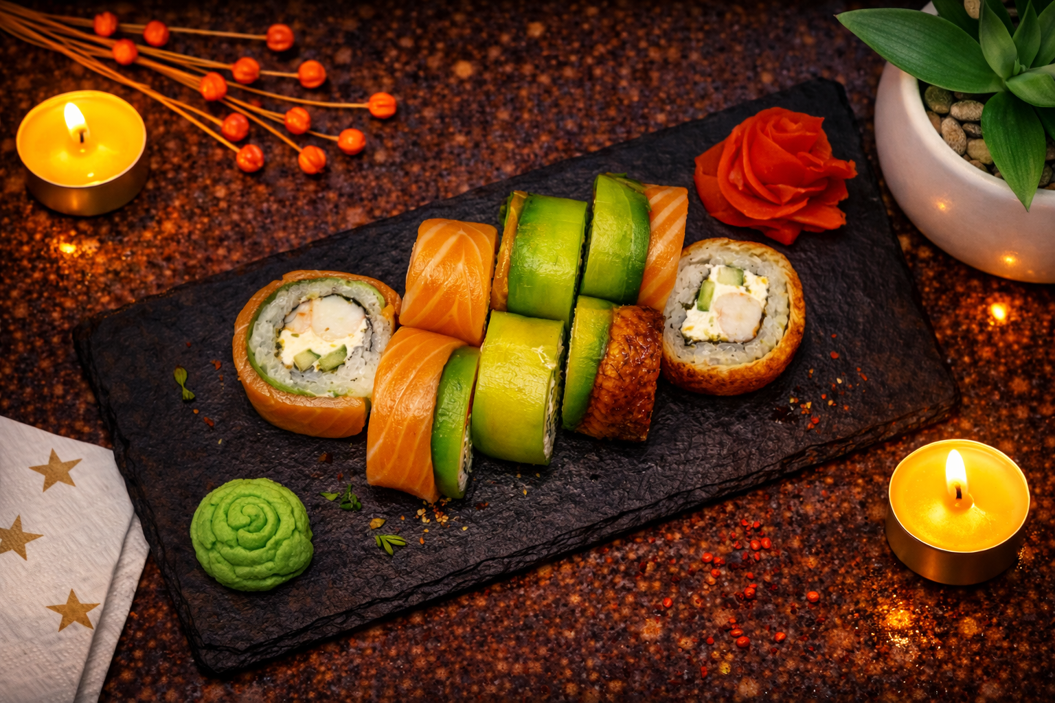 Креветка, сливочный сыр, огурец, зеленый лук, лосось, авокадо, копченый угорь, рис, нори.