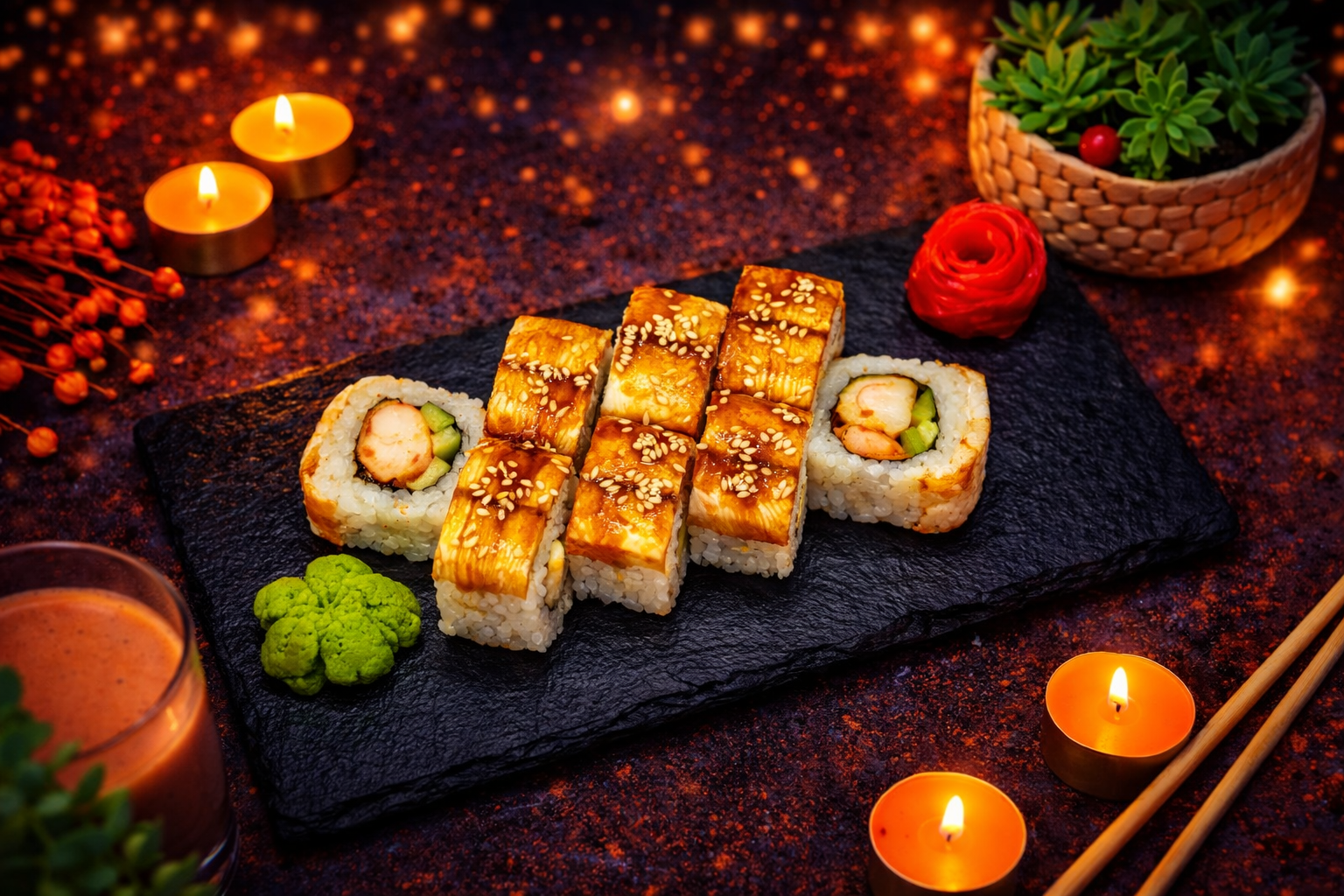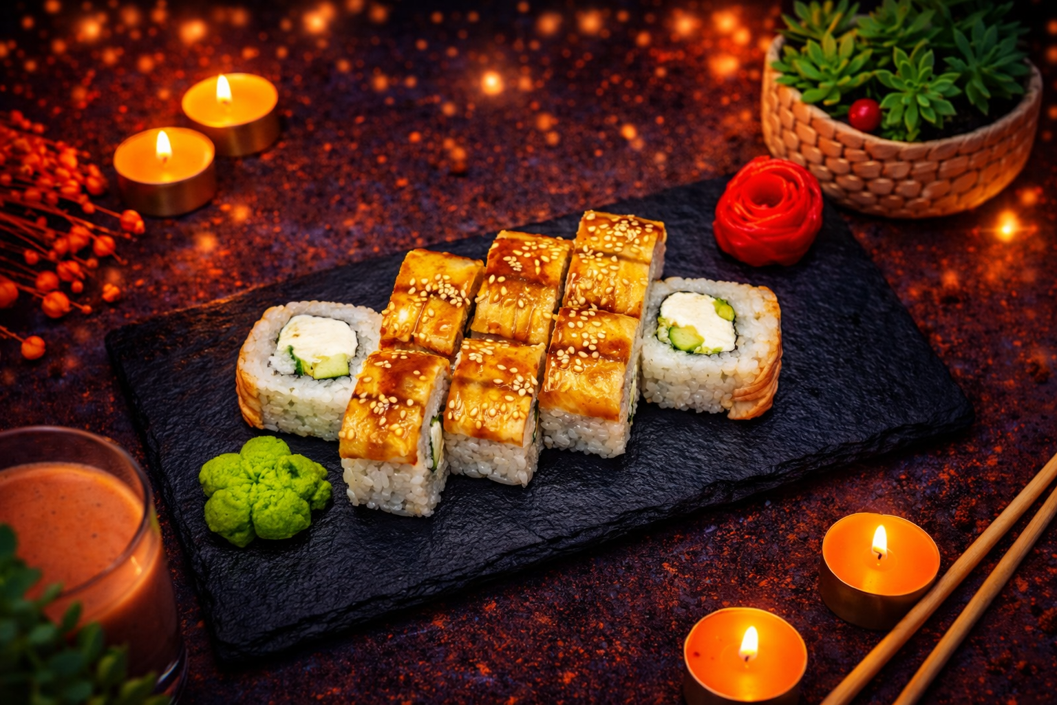 Копченый угорь, сыр, огурец, салат, икра лосося, соус "унаги", кунжут, рис, нори.