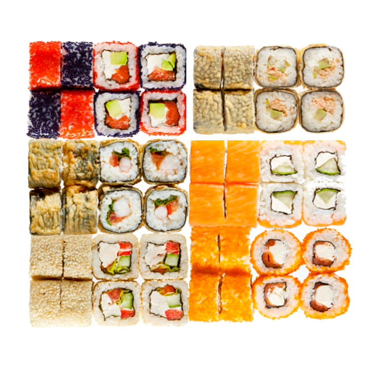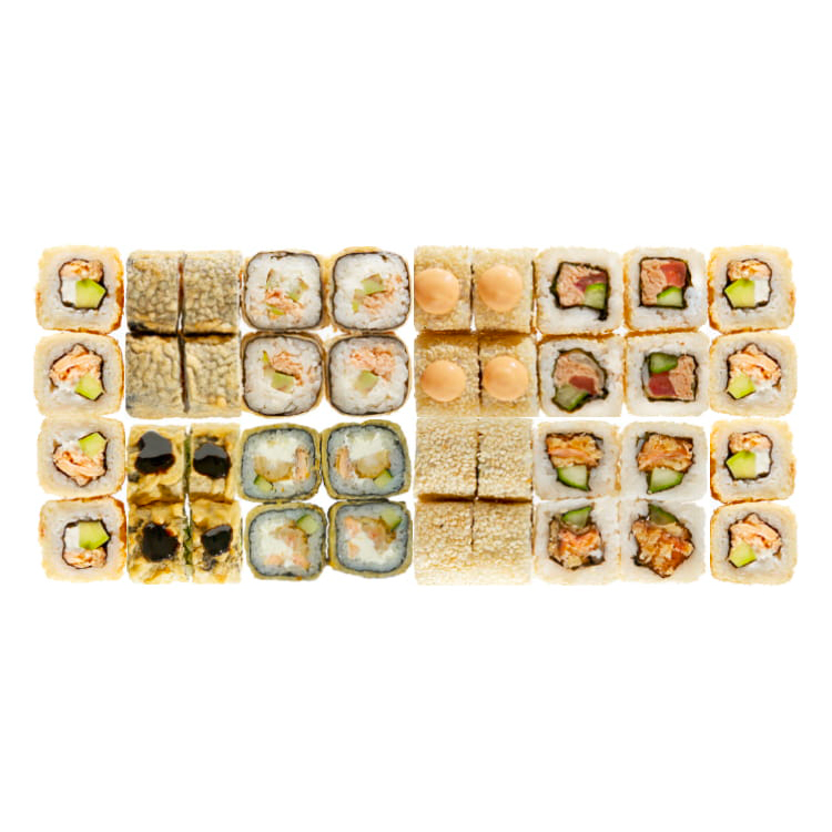 Дерзкий лосось 8 шт., Канадский 8 шт., Филадельфия медиум 8 шт., Шахматы 16 шт., С курицей в зелени 8 шт., Креветки тоже плачут 8 шт., Тобико 8 шт. Возможно попадание мелких косточек в угре!