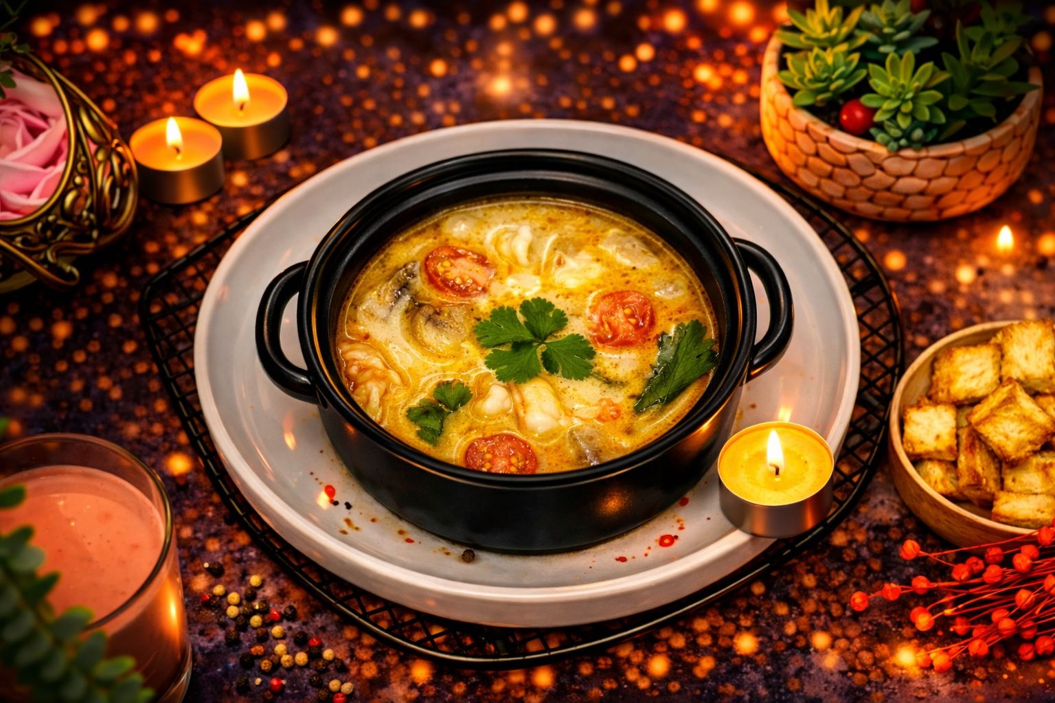 Кокосовое молоко, креветки, паста том ям, грибы шампиньоны, помидоры черри, соус рыбный, соус устричный, перец чили, лук красный, имбирь, чеснок, лайм, лимонник, рис отварной. Степень остроты: пряно-островатый, не обжигает