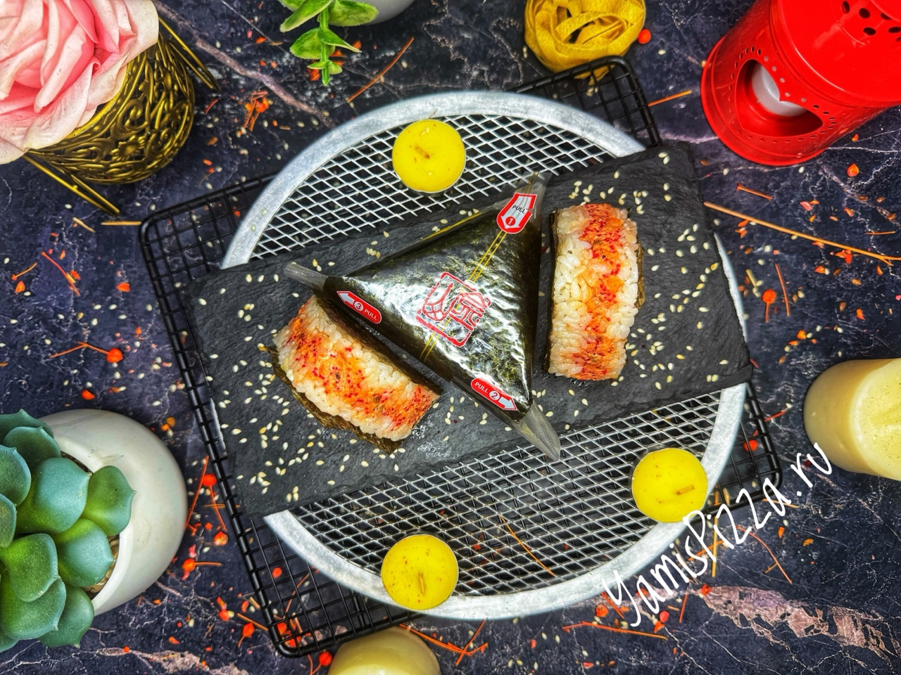 Сочные онигири со снежным крабом (суриси), икрой масаго, сливочным сыром и соусом спайси. Подается в специальной упаковке, сохраняющей хрусткость и свежесть нори. Порция 1 штука.