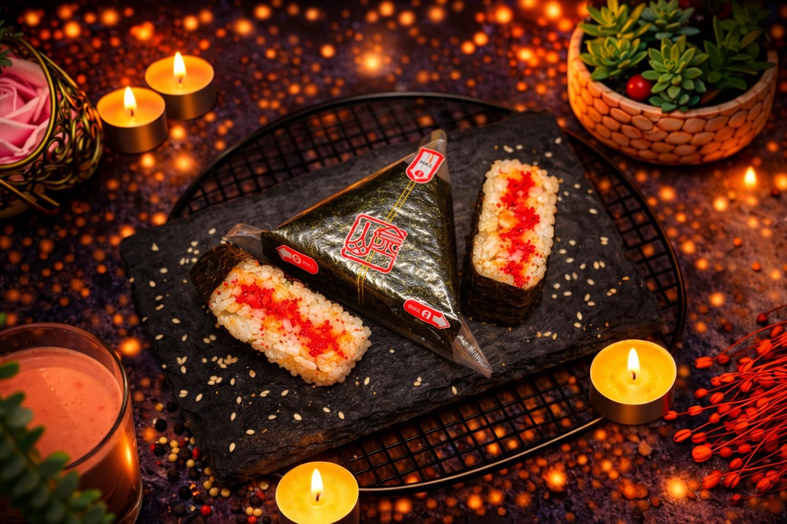Сочные онигири с креветкой, икрой масаго, сливочным сыром и соусом спайси. Подается в специальной упаковке, сохраняющей хрусткость и свежесть нори. Порция 1 штука.