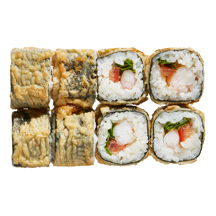 Креветка темпура, томат, зелёный лук, имбирь, рис, нори