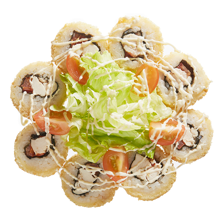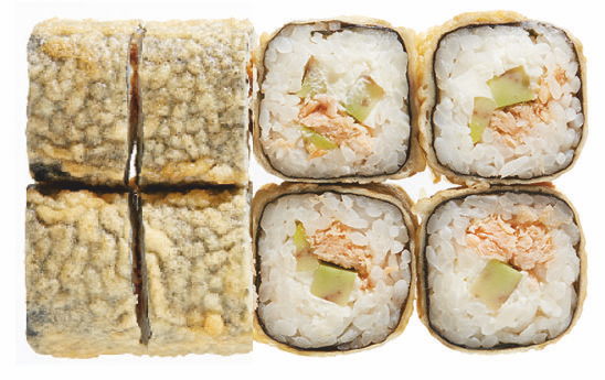 Лосось, икра Тобико, авокадо, сливочный сыр, кляр, сухари панко.